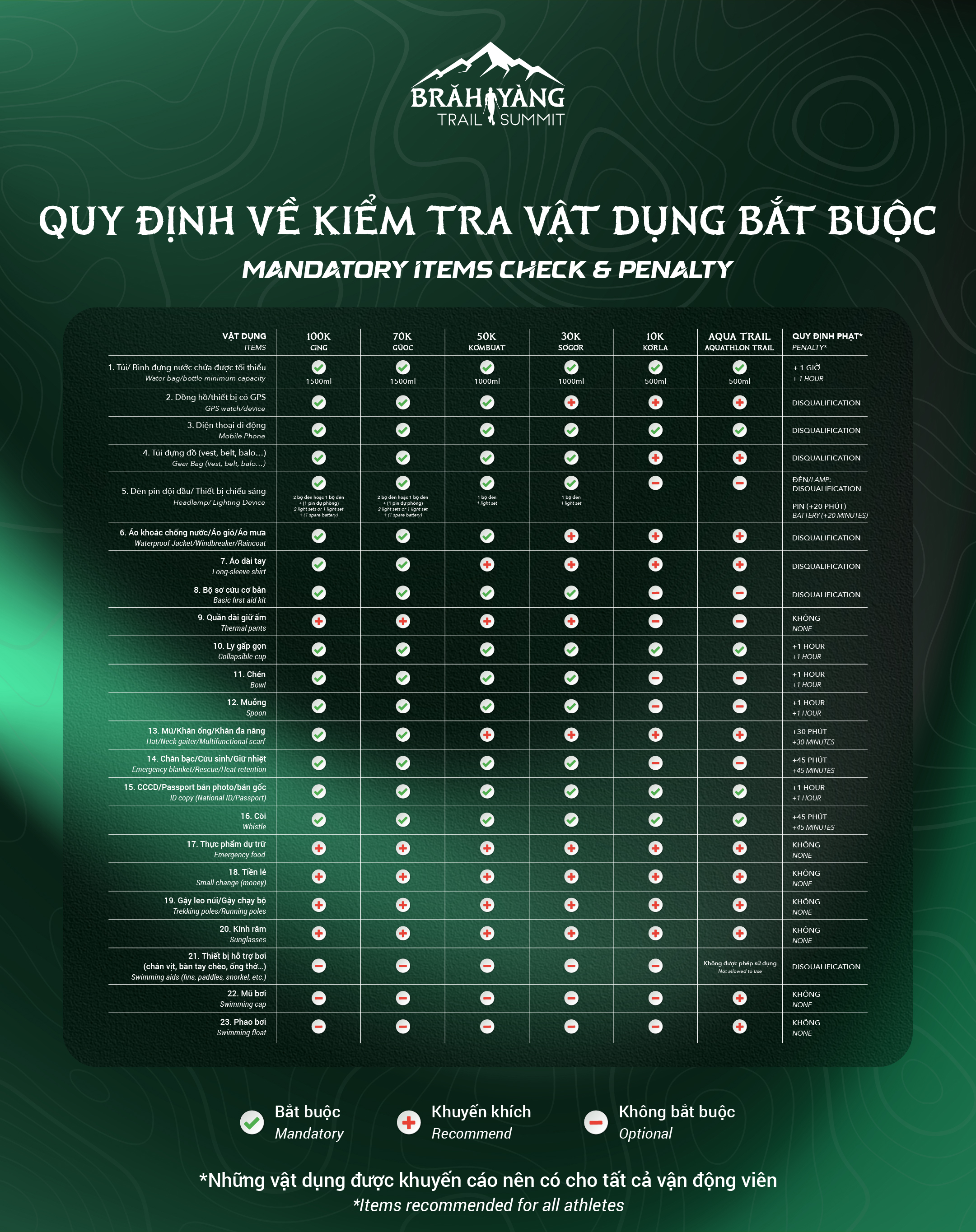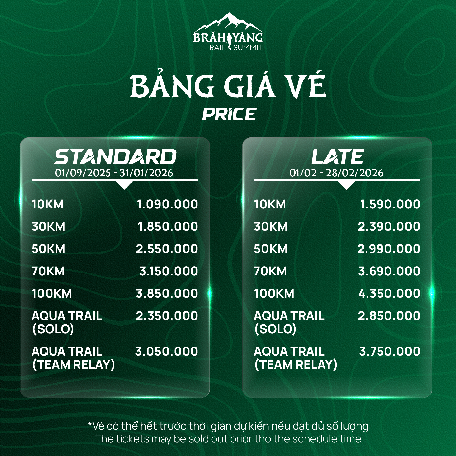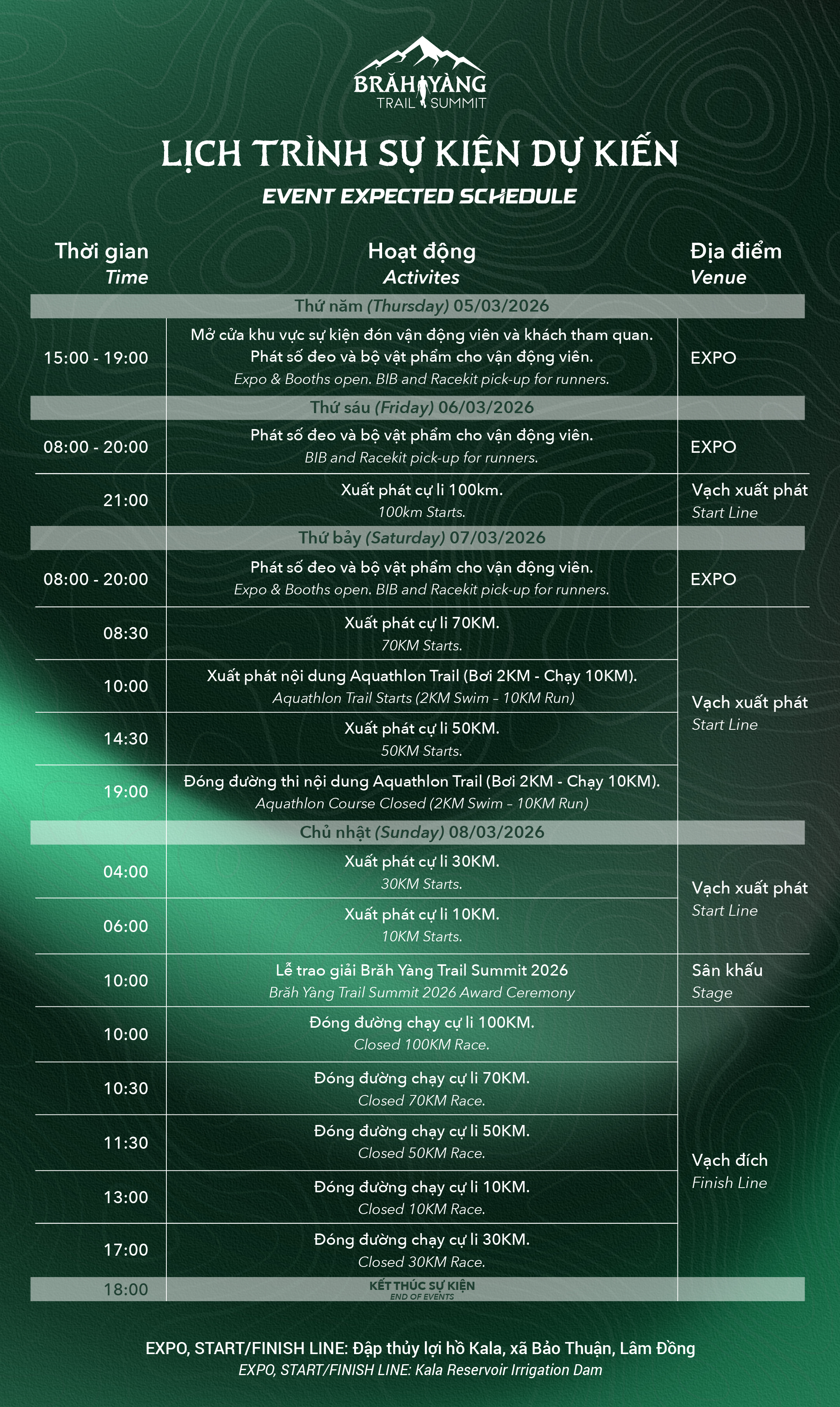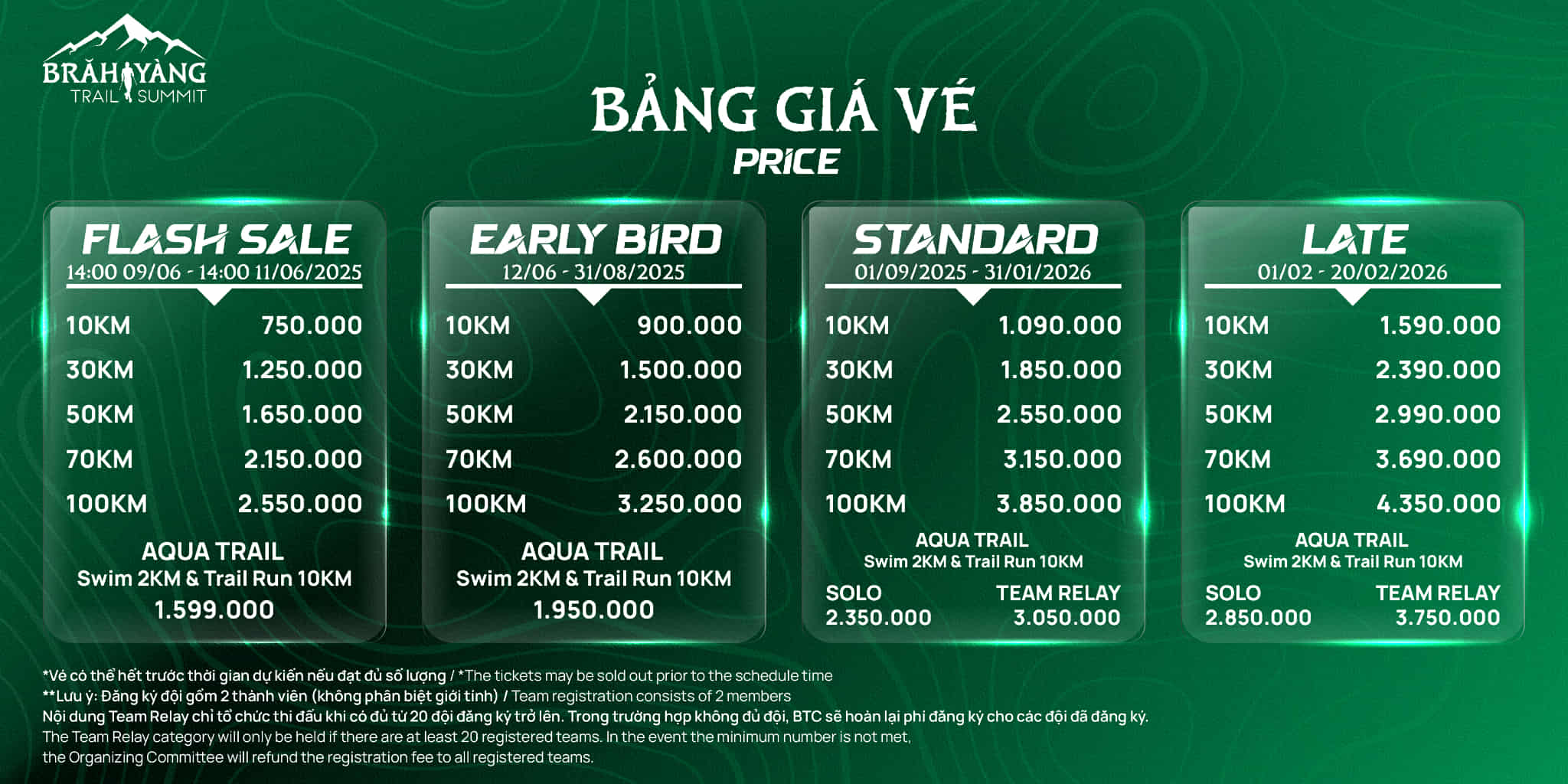Với các cự ly đa dạng: 10km, 30km, 50km, 70km, 100km cùng nội dung hoàn toàn mới Aquathlon Trail (Bơi 2km – Chạy trail 10km), giải đấu hứa hẹn mang đến trải nghiệm thể thao địa hình độc đáo và đột phá.