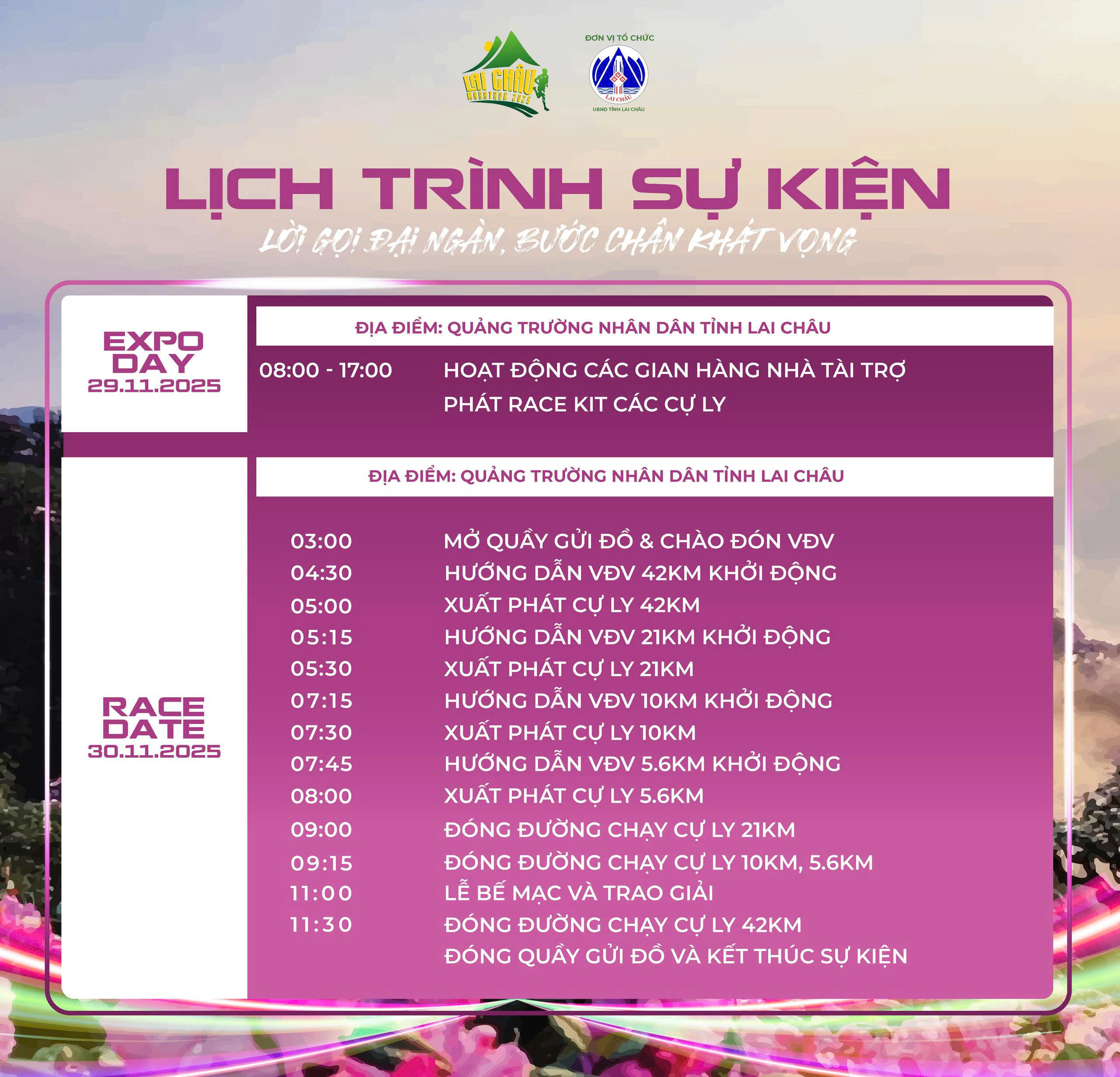 Giải Marathon Lai Châu lần thứ II năm 2025 - Lời gọi đại ngàn, bước chân khát vọng là hoạt động thể thao gắn với Tuần Du lịch - Văn hoá Lai Châu nhằm quảng bá, giới thiệu về cảnh quan thiên nhiên kỳ vĩ tươi đẹp, ẩm thực phong phú đa dạng và những giá trị văn hoá truyền thống tốt đẹp cùng với sự thân thiện, mến khách của nhân dân các dân tộc trên địa bàn tỉnh tới đông đảo du khách trong nước và quốc tế; tạo dấu ấn cho du khách về một điểm đến an toàn, hấp hẫn, mến khách.