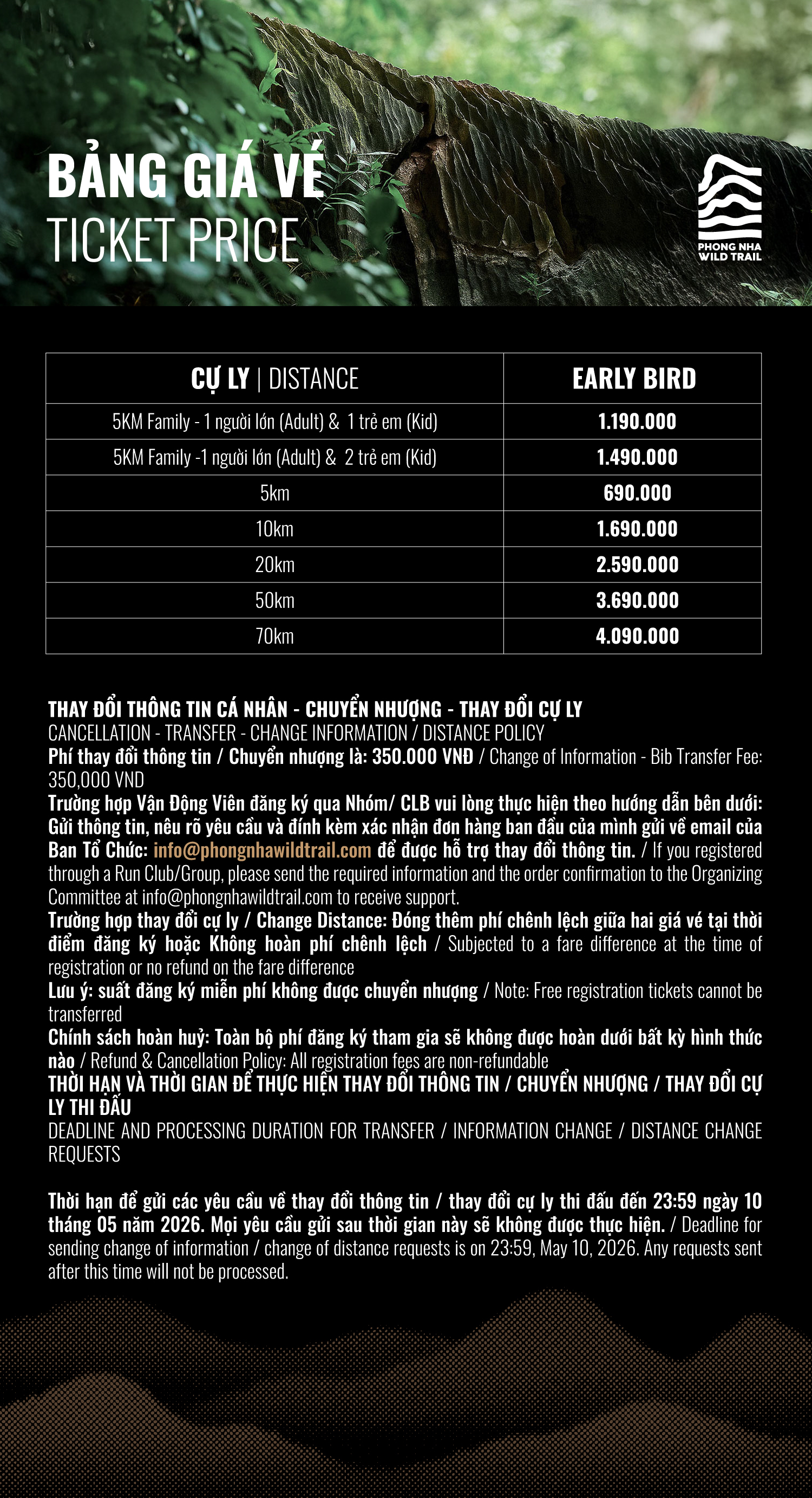 Giải chạy đường mòn Phong Nha Wild Trail (PNWT®) sẽ được tổ chức tại Vườn quốc gia Phong Nha – Kẻ Bàng, tỉnh Quảng Trị, từ ngày 28,29,30,31 tháng 05 năm 2026. Cuộc đua chính thức sẽ được tổ chức vào ngày 30 tháng 5. Những ngày còn lại dành cho lễ hội ẩm thực và âm nhạc.Đây là một giải chạy đường mòn quốc tế chuyên nghiệp, tôn vinh vẻ đẹp của thiên nhiên, đóng góp vào công tác bảo tồn Di sản Thiên nhiên Thế giới được UNESCO công nhận hai lần, đồng thời thúc đẩy phát triển cộng đồng địa phương.