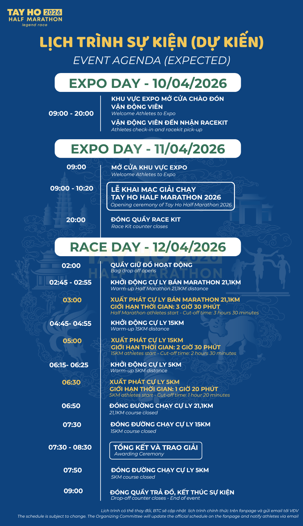 - Tay Ho Half Marathon 2026 is organized by VRace (by VuMedia) – a highly experienced organizer that has successfully managed and operated multiple previous editions of the race. The event is professionally executed in close coordination with partners and relevant authorities, ensuring not only a safe and seamless experience for runners but also creating opportunities for local residents and visitors to immerse themselves in the vibrant race atmosphere.